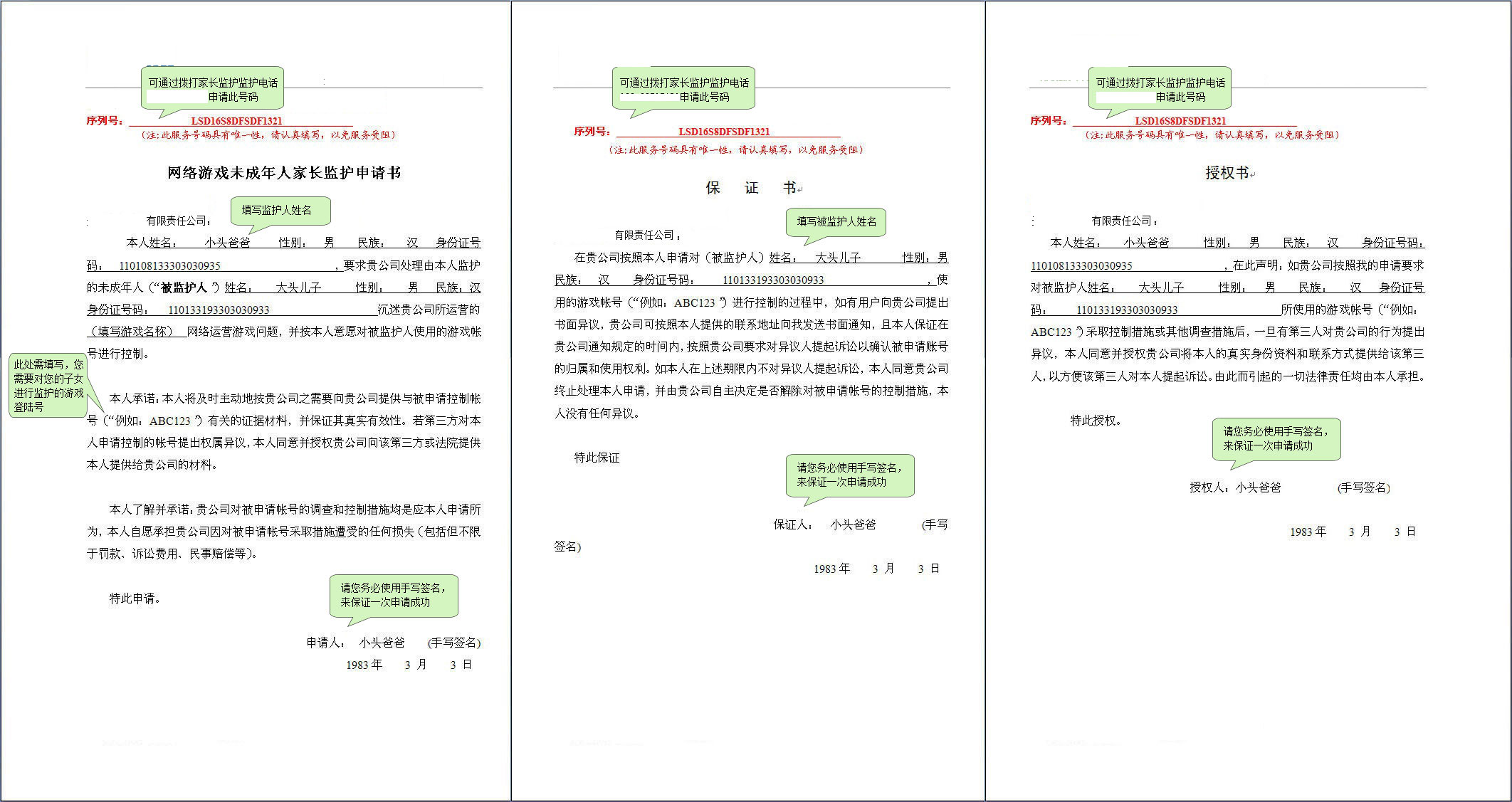 1、監(jiān)護人需要進行監(jiān)護申請時,撥打?qū)>€電話17719861303,提交被監(jiān)護人賬號、所玩的表演、服務(wù)器、監(jiān)護人聯(lián)系電話后,即可獲得服務(wù)申請序列號;